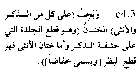 e4.3 Circumcision is obligatory (O: for both men and women. For men it consists of removing the prepuce from the penis, and for women, removing the prepuce (Ar. Bazr) of the clitoris (n: not the clitoris itself, as some mistakenly assert). (A: Hanbalis hold that circumcision of women is not obligatory but sunna, while Hanafis consider it a mere courtesy to the husband.)"